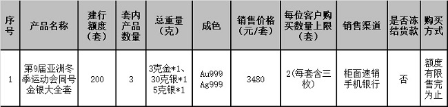 根据中国人民银行贵金属纪念币发行安排,“第9届亚洲冬季运动会金银纪念币”已于近日公告发行,我行根据安排将参与本产品的销售工作。现将有关事项公告如下:
